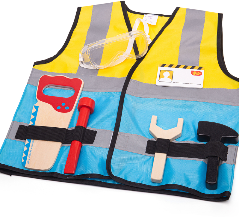 Met deze bouwvakker verkleedset van BigJigs beleven kinderen eindeloos speelplezier op de bouwplaats! Trek het fluorescerend gele en blauwe jasje aan, zet je veiligheidsbril op en pak de houten gereedschappen erbij: er is altijd iets te bouwen of te repareren. Deze set is speciaal ontworpen voor jonge bouwers van 3 tot 5 jaar en stimuleert fantasierijk rollenspel.