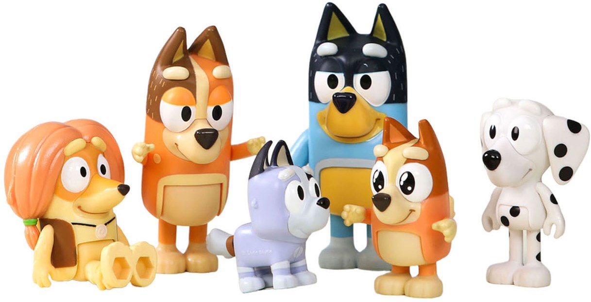 Kijk jij ook altijd naar de avonturen van Bluey? Bluey is een 6 jaar oude Heeler-hond die samen met haar familie de leukste avonturen beleeft. Speel nu met de 8 speelfiguurtjes van Bluey, Bingo, Bandit, Chilli, Socks, Honey, Chloe en Indy. Hun armen en benen zijn beweegbaar, dus je kunt ze in allerlei poses neerzetten. Perfect voor kleine handjes om mee te spelen! Gebruik deze 8 speelfiguurtjes met de verschillende speelsets van Bluey (los verkrijgbaar). Leeftijdsindicatie: 3 jaar+.